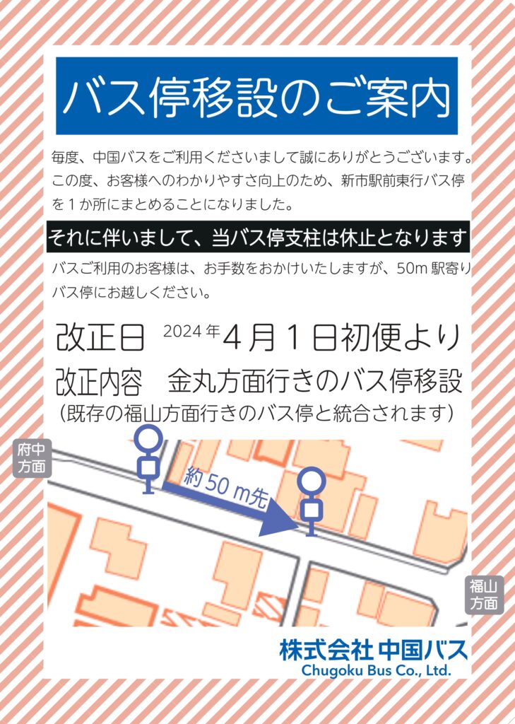 【2024年4月1日(月)~】新市駅前停留所移設のお知らせ いつも中国バスをご利用いただきましてありがとうございます。 2024年4月1日の初便より「新市駅前(金丸方面行)」停留所を移設いたします。 詳しくは下記をご確認ください。