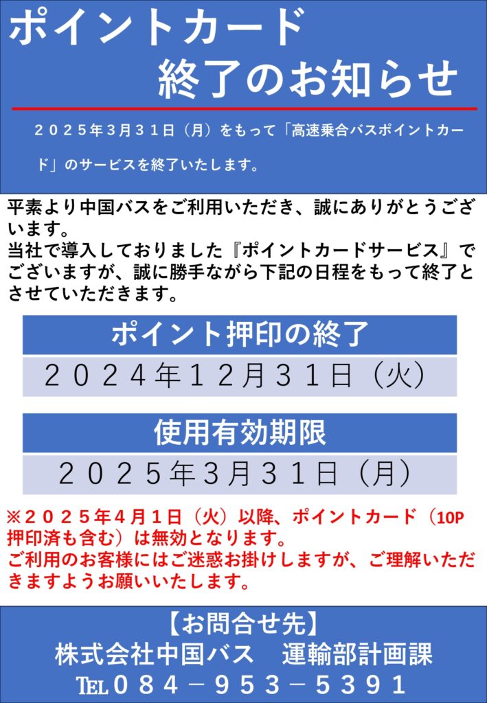 高速乗合バス各路線にて取り扱っておりました、ポイントカードサービスについて、下記の通り、終了させていただきます。