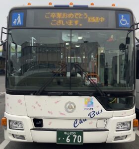 また福山地区を運行する路線バスの1車両は今回作成いただいたすべてのポスターと卒業生へのお祝い仕様に飾りつけした特別車両を運行いたします。