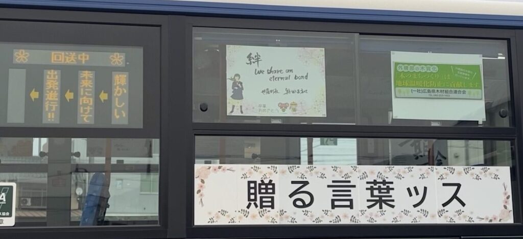 路線バスに沿線の学校、自治体等に作成いただいた卒業生へ向けたメッセージポスターを掲示しております。
