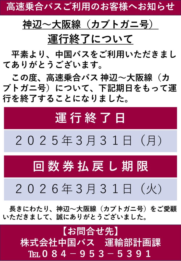 【2025年3月31日(月)】神辺⇔大阪線(カブトガニ号)運行終了について