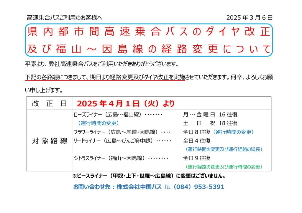 【高速バス】ダイヤ改正及び経路変更のお知らせ(ローズライナー・フラワーライナー・リードライナー・シトラスライナー)