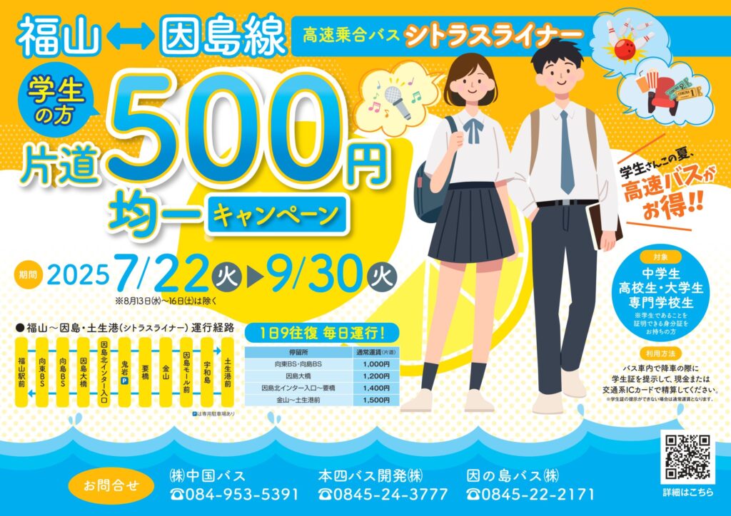 広島県内を運行する高速バスにおいて、学生運賃均一キャンペーンを実施いたします。夏休みのお出かけなどに、お得な高速バスをぜひご利用ください。