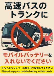 また、パソコン、スマートフォン、タブレット等のリチウムイオン電池搭載機器も同様に、必ず車内へお持ち込みください。お客様が安全・安心に高速バスをご利用いただけますよう、ご理解とご協力をお願い申し上げます。