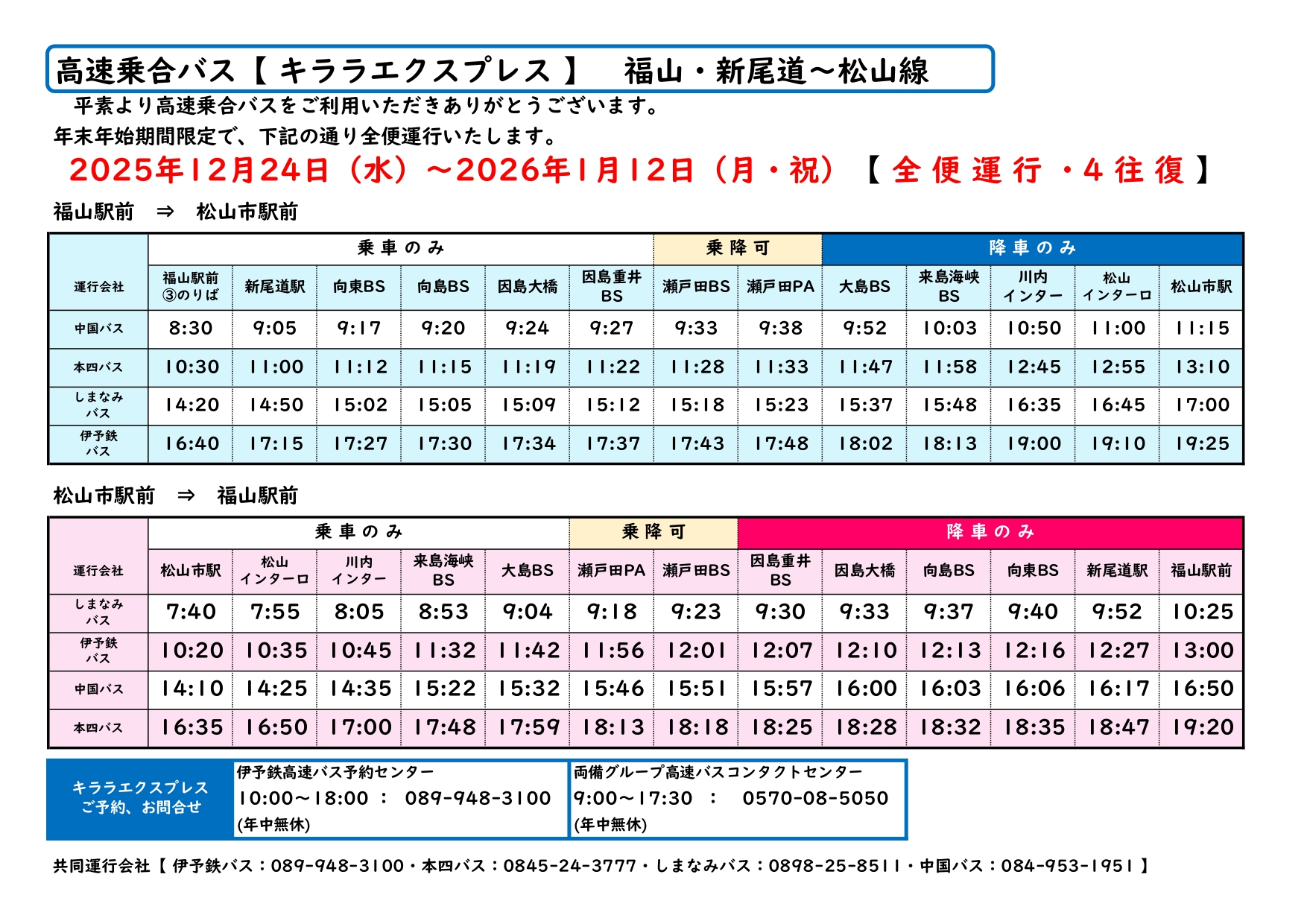 2025年12月24日(水)~2026年1月12日(月・祝)の間、1日4往復へ全便再開して運行いたします。
