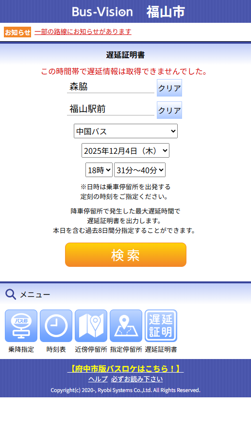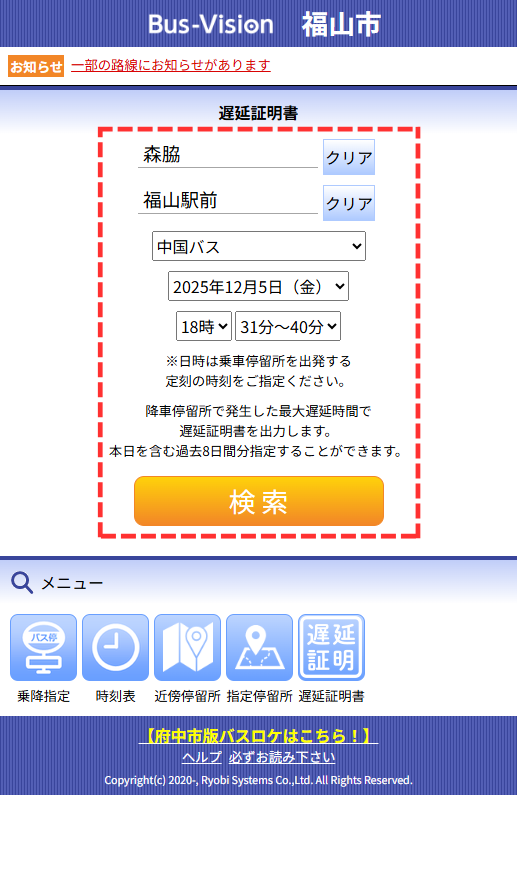 ②遅延証明書を発行する区間の停留所の入力、日時を指定し、検索ボタンを押下します。