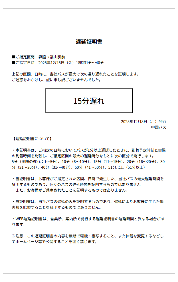 ・本証明書は、バスに乗車したことを証明するものではありません。また、遅延によりお客様に生じた