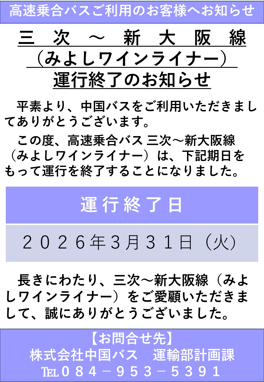 【2026年3月31日(火)】三次⇔新大阪線(みよしワインライナー)運行終了について