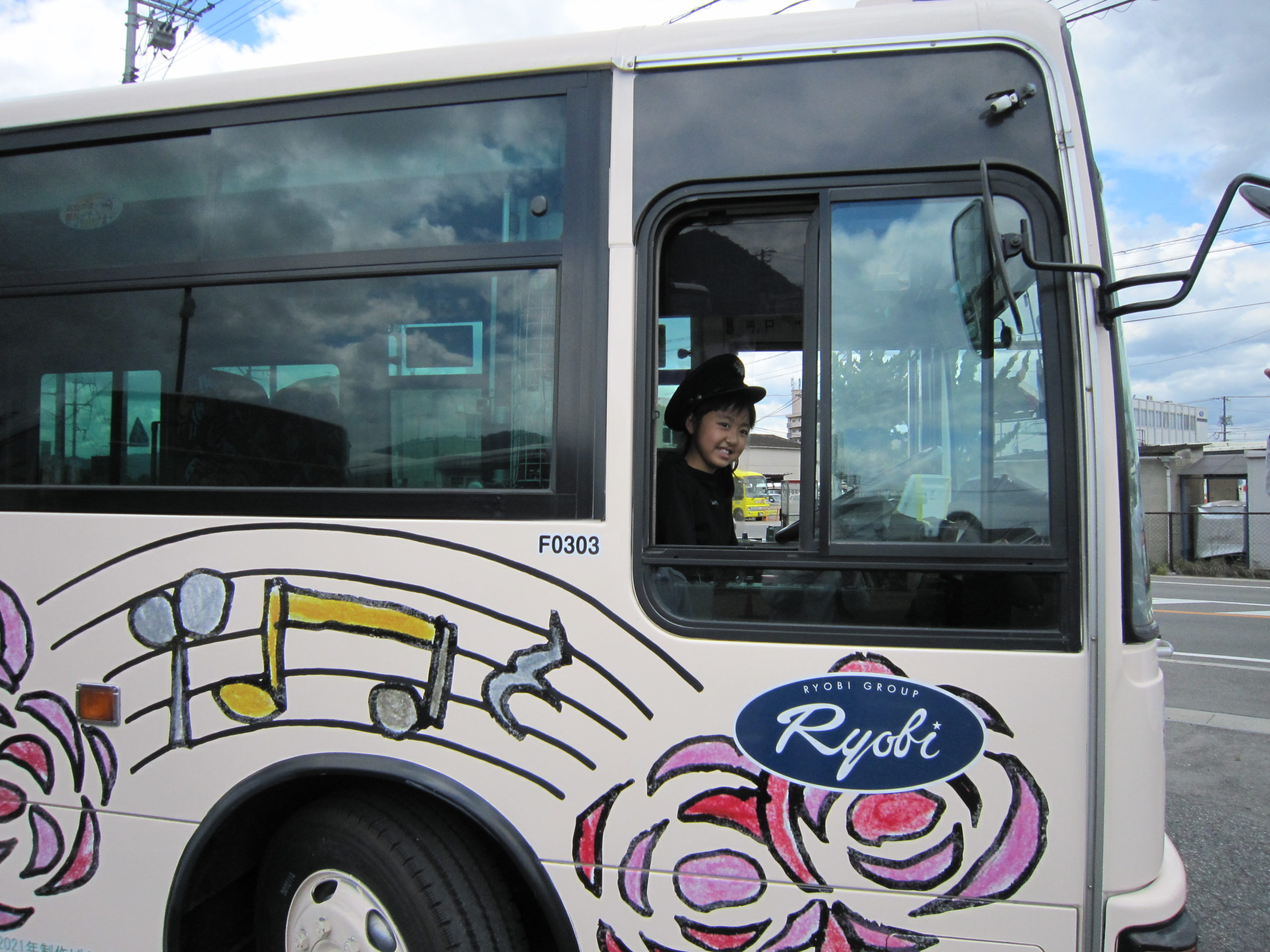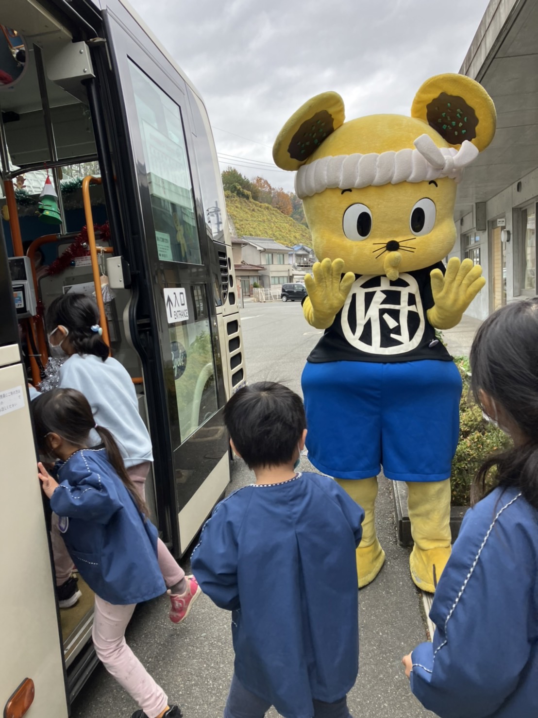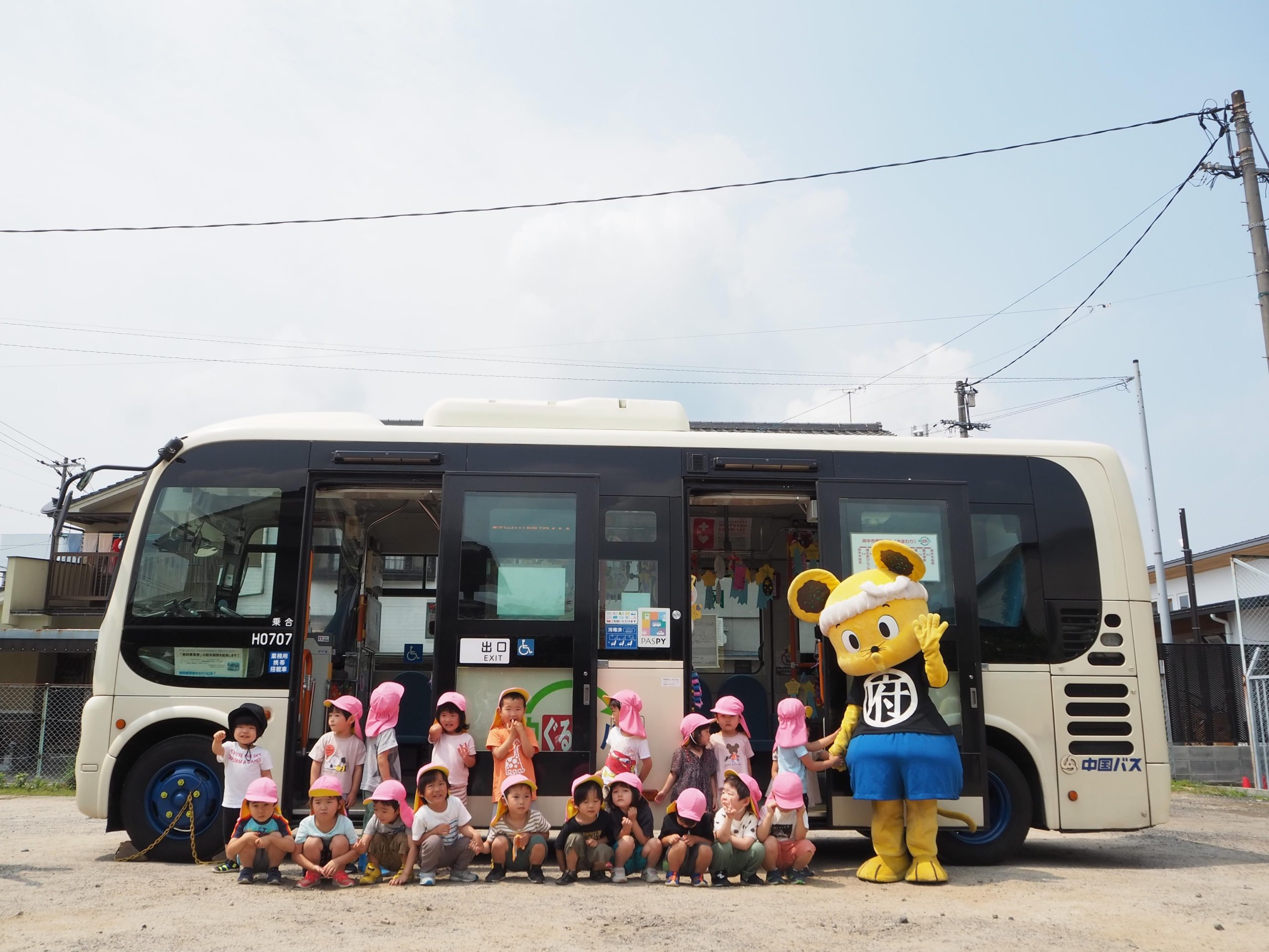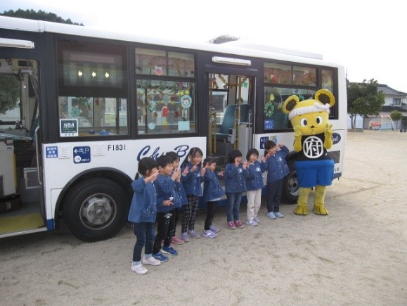園児のみなさんは我先にとバスに乗り込んで飾り付けをし、とても楽しそうな様子でした。備後府中焼きマスコットキャラクター『ミンチュー』の登場には大盛り上がり、大きな歓声が上がりました。綺麗に彩られたバスは園児のみなさんを乗せ、園内を走行。『降車ボタン』が大好きなようで、ボタンを連打する園児に、乗務員は笑顔で「はい!次止まります!」と何度も何度も車内案内を行い大忙しでした。