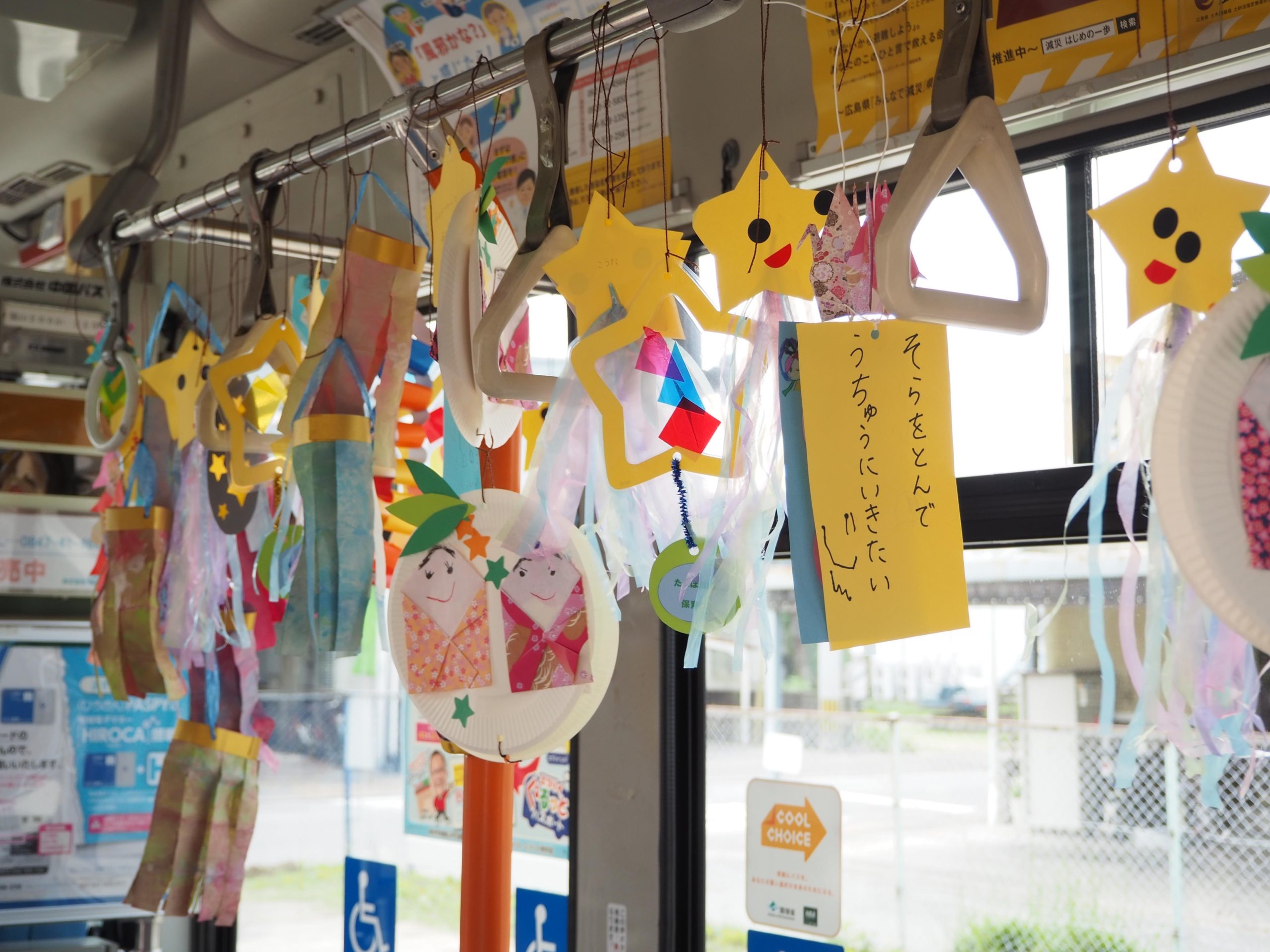このぐるっとバスは今年の4月に導入された備後初のEV車両で鮮やかな短冊飾りでより一層彩を増しました。車内に設置されたミニ笹にお願い事の短冊を一生懸命取り付ける園児の皆さんは可愛らしい笑顔であふれていました。