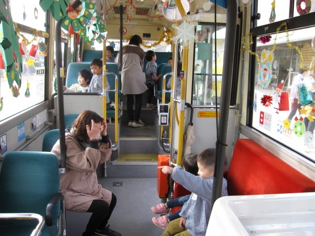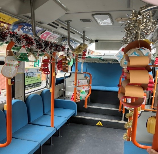 今年もクリスマスの時期が近づいてきました。それに先駆けて12月1日に広谷保育所、12月7日に上下保育所の園児たちにバス車内をクリスマス仕様に飾りつけしてもらいました。いつもと違うクリスマス一色になったバスを前に園児たちからは笑顔がこぼれ少し早めのクリスマス気分を味わっていました。子供たちからは「楽しかった」「またやりたい」「運転手さんになりたい」などの感想を聞くことができ、私たちもお手伝いをしながら園児たちの笑顔に和まされる一日となりました。