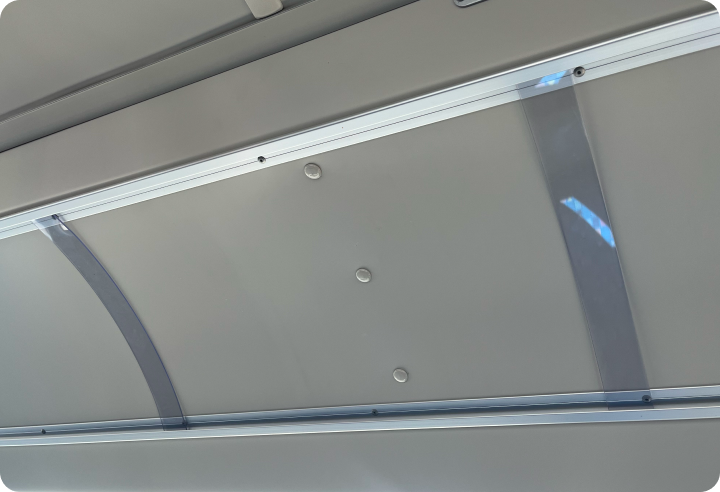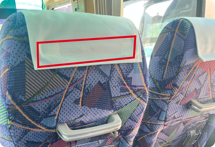 乗っているお客様の目線に合わせて、広告を展開します。バス車内という限られた空間で、多くの人の目に入りやすい広告です。