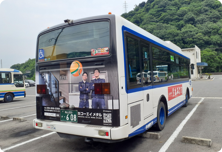 バスのボディ部分を使用した広告です。用途に応じてフルラッピングから側面や後部のみのラッピングまで対応いたします。日々の運行を通じて多くの人の目に触れますので、幅広い層へ自然にアプローチすることが可能です。