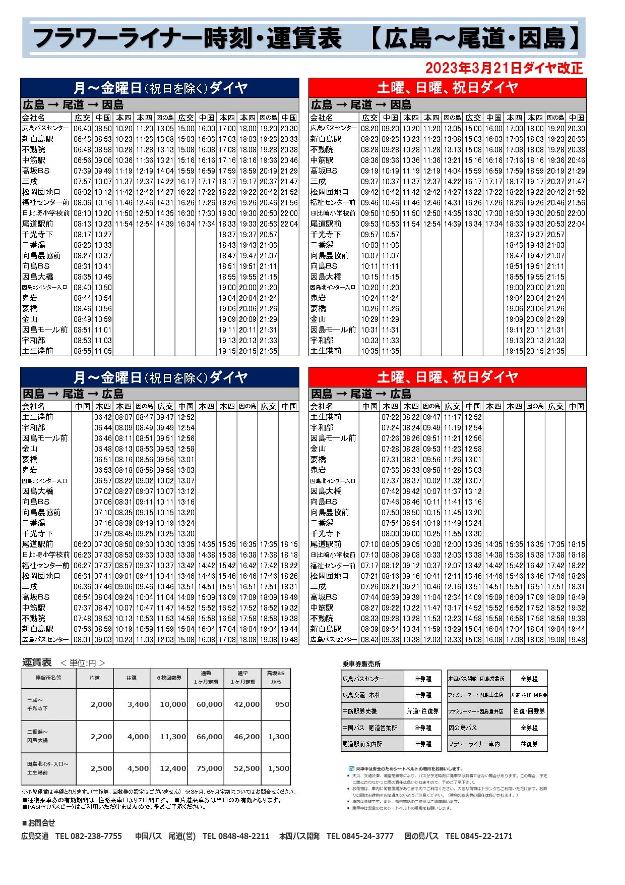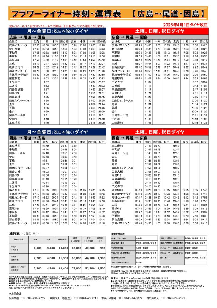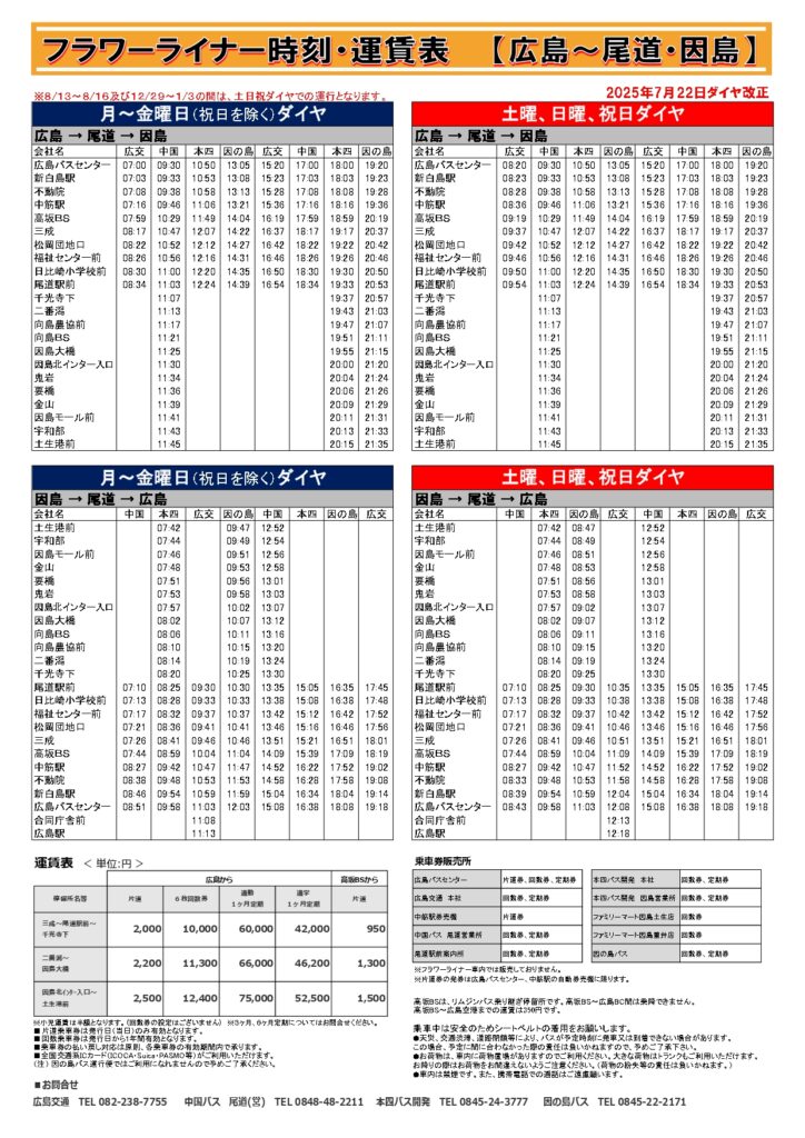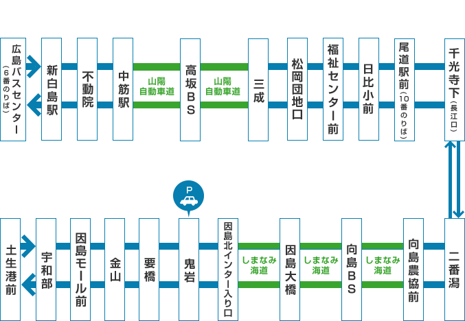 ※尾道 ⇔ 因島(土生港) へは 広島~ 尾道線(フラワーライナー)の尾道駅前発着便 と 因島 ~ 尾道線(路線バス) での乗継ぎも可能です。 時刻表はこちら(因島 土生港⇔尾道駅前) 尾道~因島線(路線バス)に関するお問い合わせは、本四バス(0845-24-3777)・ 因の島バス(0845-22-2171)・おのみちバス(0848-46-4301)へお願いいたします。 |
