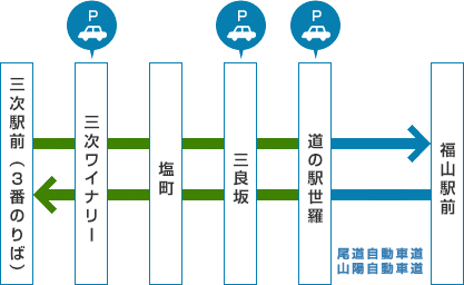 | 福山駅前 | 道の駅世羅 | 三良坂 | 塩町 | 三次ワイナリー | 三次駅前3番のりば (三次バスセンター) |