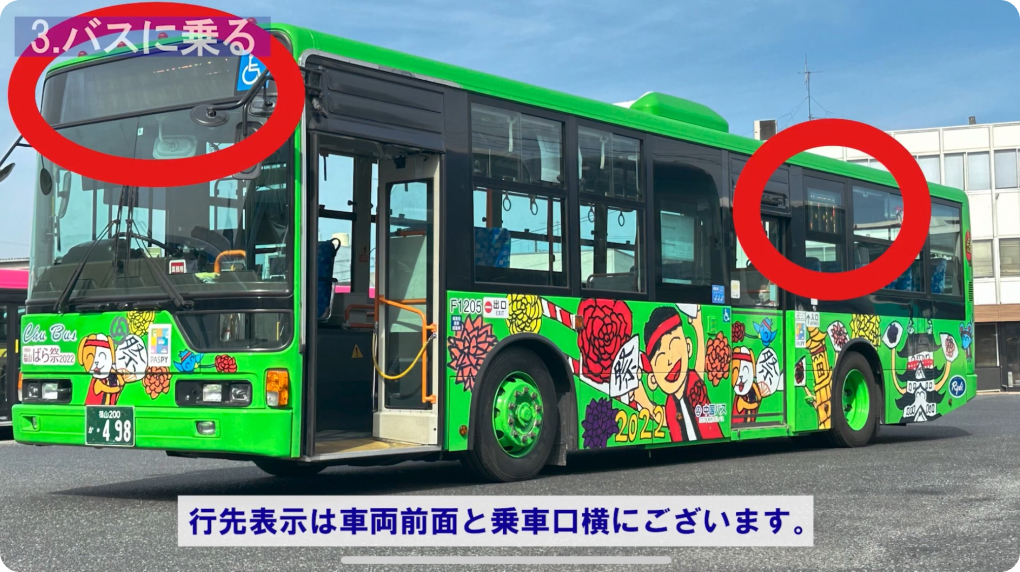 バスの車両前面と後面、乗車口横に行先表示がございます。